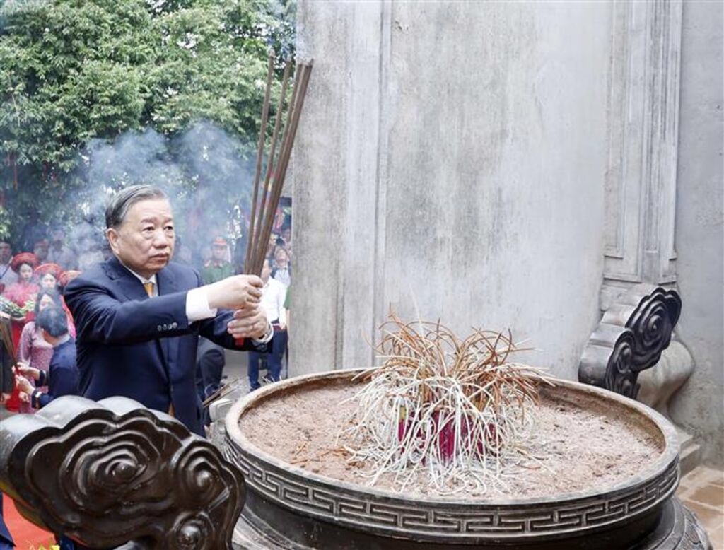 Accompagné de dirigeants du Parti, de l’État et des autorités locales, Tô Lâm s’est rendu au sanctuaire supérieur pour offrir encens, fleurs et présents, exprimant reconnaissance et gratitude envers les rois fondateurs Hùng ainsi que les ancêtres qui ont contribué à bâtir et défendre le pays.