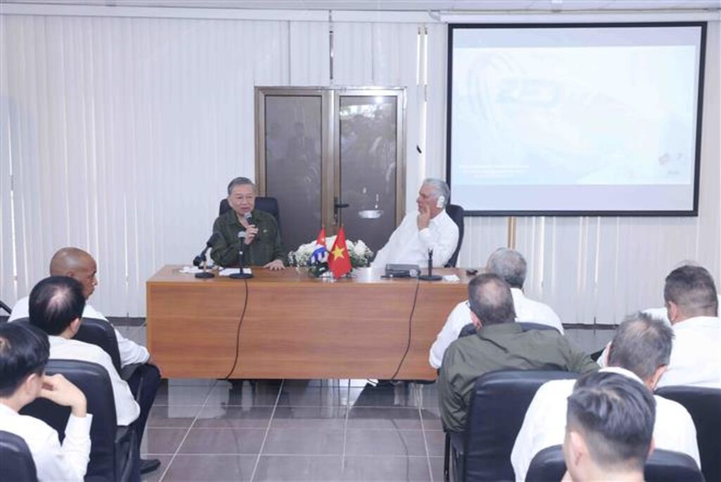 | Le secrétaire général du Parti et président vietnamien Tô Lâm (gauche) prenant la parole lors de la rencontre avec les investisseurs de la zone spéciale de développement de Mariel. |