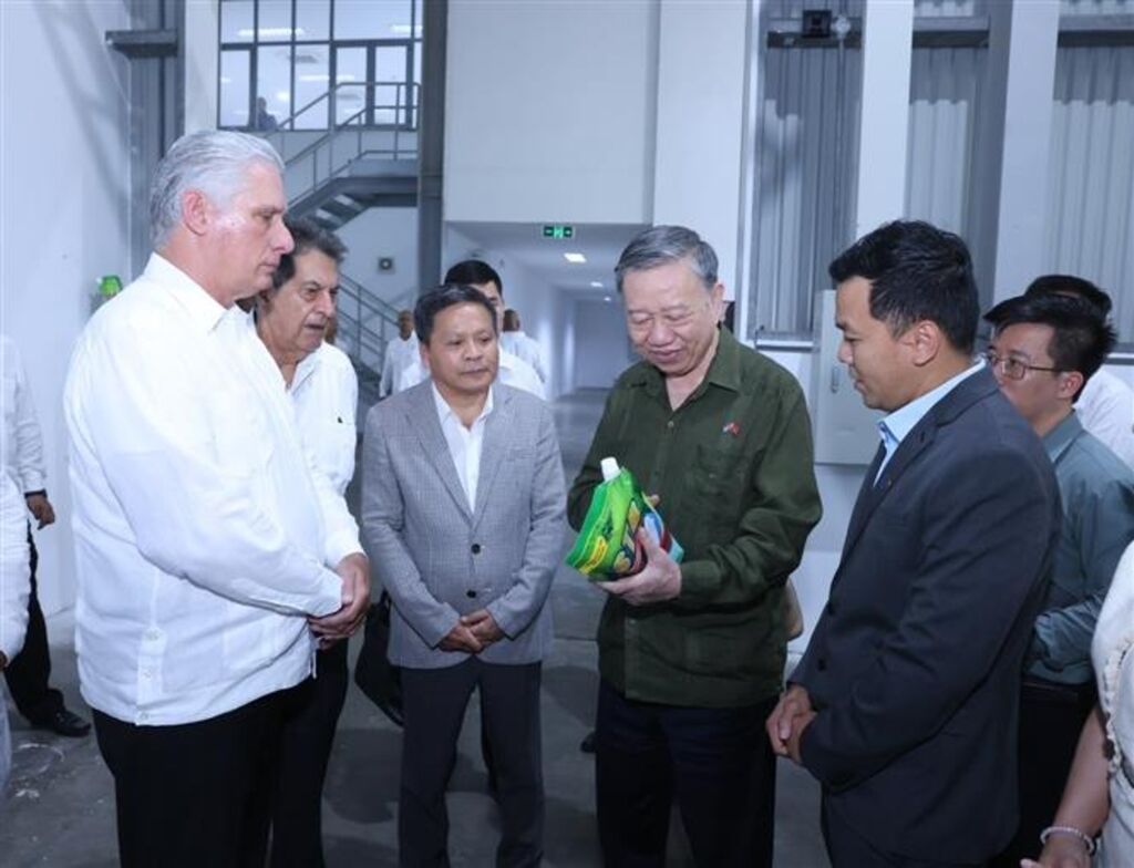 | Le secrétaire général et président Tô Lâm (centre) et le premier secrétaire du Parti communiste cubain et président cubain Miguel Diaz Canel Bermudez (gauche) dans l'usine de lessive qui est une coentreprise entre la société par actions Thai Binh Global Investment et la société d'engrais ATG. |