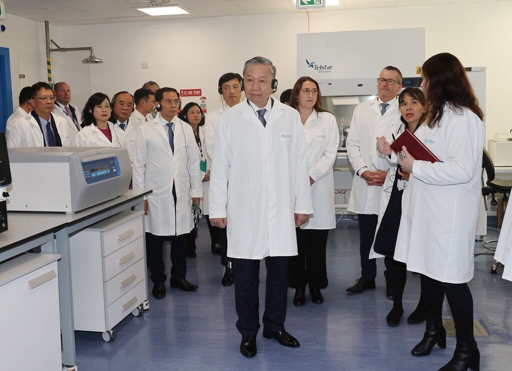 | Le secrétaire général du Parti communiste du Vietnam et président vietnamien Tô Lâm (centre) visitant l’Institut national de recherche et de formation en bioprocédés (NIBRT), à Dublin, le 3 octobre. |