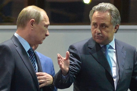 | Le président russe Vladimir Poutine (gauche) et le ministre des Sports, Vitali Moutko, à Sotchi en Russie en 2015 |