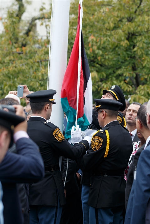 "Dans ce moment historique, je dis à mon peuple partout : hissez le drapeau palestinien très haut, parce que c'est le symbole de notre identité. C'est un jour de fierté", a déclaré le président palestinien Mahmoud Abbas, au début de la cérémonie à laquelle assistaient plusieurs centaines de personnes, parmi lesquelles le secrétaire général de l'ONU Ban Ki-moon.