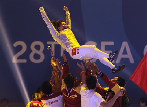 | Lê Dung après sa victoire aux SEA Games 28, en 2015 à Singapour. |
