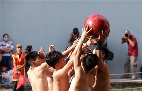 | Au festival Vât Câu, les joueurs luttent pour s'emparer de la balle tout en essayant de ne pas blesser leurs adversaires. |