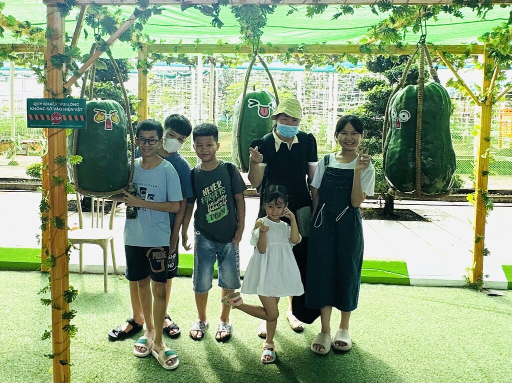 | Touristes dans une ferme fruitière de Suôi Tiên. |