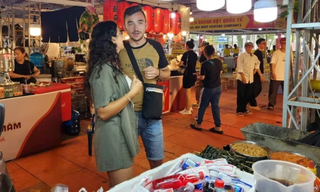 | Maria et son ami cherchent des plats vietnamiens lors du festival le soir du 23 octobre. |