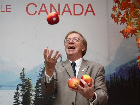 | L'ambassadeur du Canada au Vietnam, David Devine, présente les pommes canadiennes frais Ambrosia. |