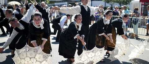 | Des danseurs en costumes traditionnels participent à une parade dans les rues de Lorient lors du festival. |