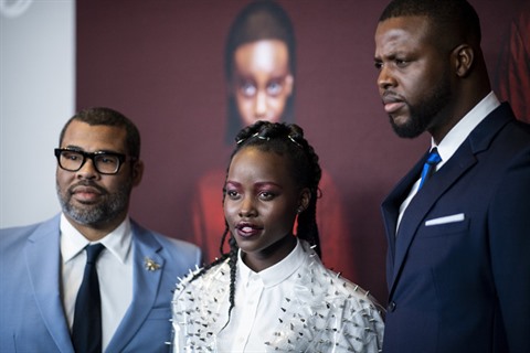 | Le réalisateur Jordan Peele (gauche) avec les acteurs Lupita Nyong'o et Winston Duke, le 19 mars à New York. |