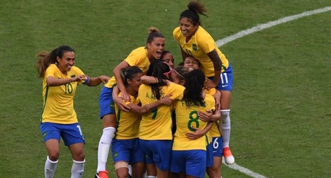 | Les Brésiliennes se congratulent après le but inscrit par Monica contre la Chine, le 3 août au stade olympique Enghenao. |
