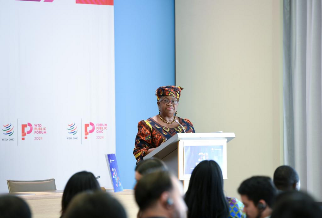 | La directrice générale de l'OMC, Ngozi Okonjo-Iweala au Forum public 2024 de l'OMC, le 10 septembre à Genève. |