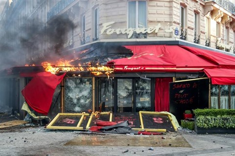 | Le Fouquet's incendié lors d'une manifestation de "gilets jaunes" à Paris le 16 mars. |