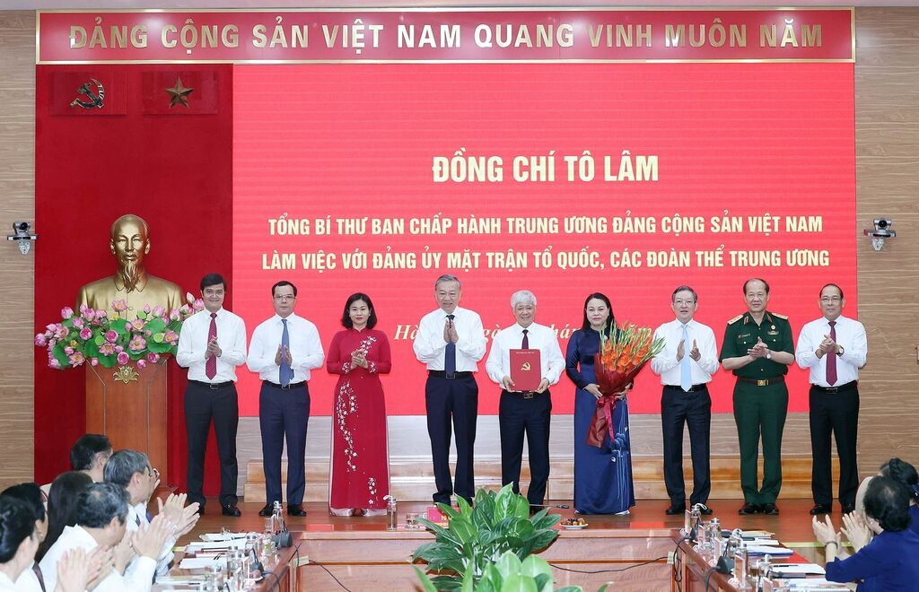 Lors de la séance de travail, le secrétaire général Tô Lâm a présenté au Comité du Parti du FPV et aux organisations de masse centrales la décision n°304-QD/TW du Politburo, qui définit la nouvelle structure, les nouvelles fonctions et les nouvelles missions du Comité central du FPV, marquant ainsi une étape importante dans l’amélioration de son efficacité organisationnelle.