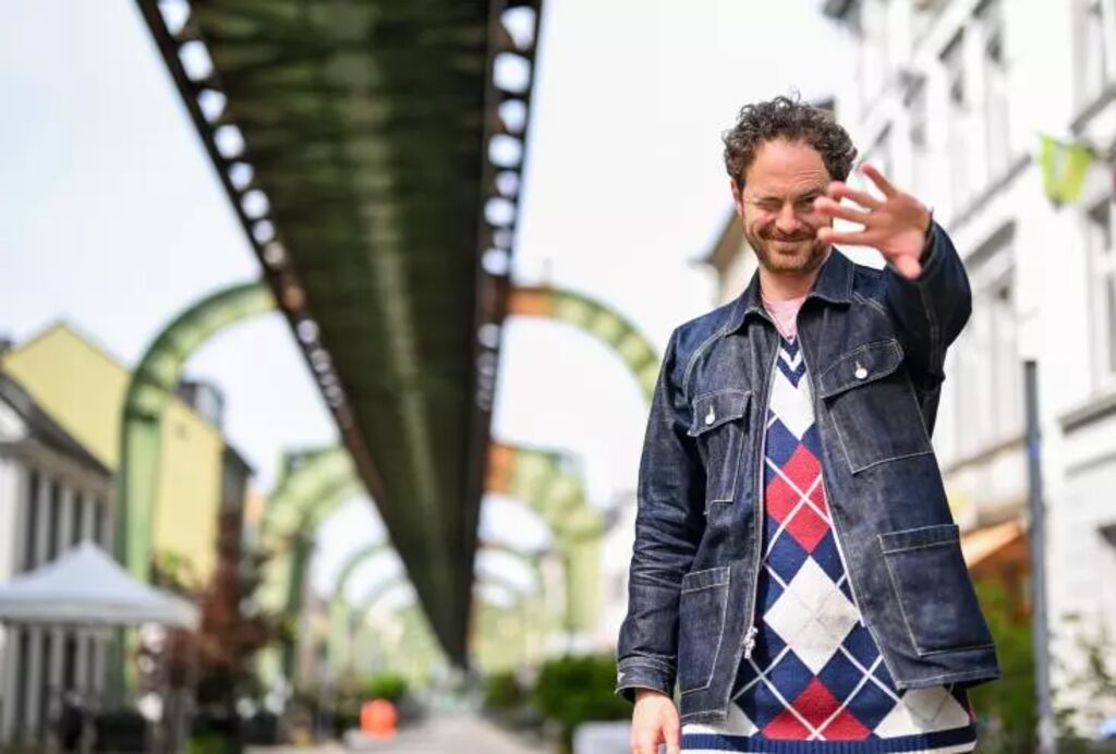 | Le Français Boris Charmatz pose sous le monorail suspendu de Wuppertal, ville de la Ruhr dans l'Ouest de l'Allemagne, le 21 mai. |