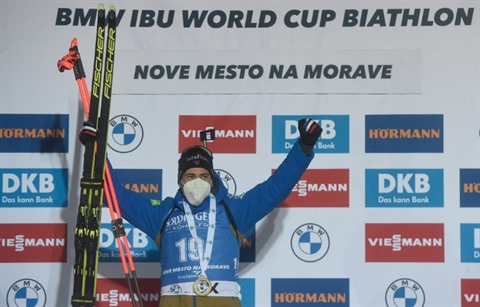 | Quentin Fillon-Maillet sur la 1re marche du podium du sprint 10km de Nove Mesto na Morave, en République tchèque, le 11 mars. |