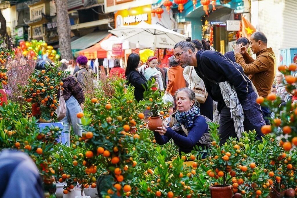 | Des touristes étrangers au marché aux fleurs de Hàng Luoc, à Hanoi, lors du Têt du Cheval 2026. |