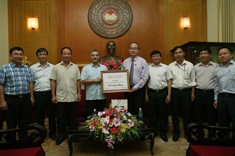 | Le président du Front de la Patrie du Vietnam, Nguyên Thiên Nhân (centre), reçoit 310 millions de dông de l'Agence Vietnamienne d'Information |