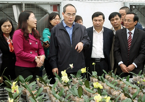 | Le président du FPV, Nguyên Thiên Nhân (Centre), visite une ferme de culture des orchidées des paysans au district de Dan Phuong (Hanoi). |