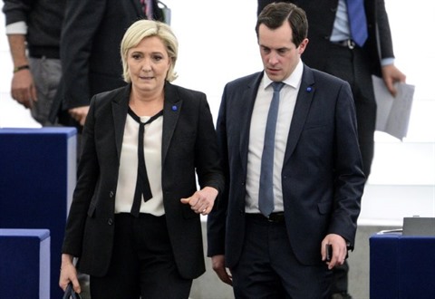 | La présidente du Front national, Marine Le Pen, et le secrétaire général du parti, Nicolas Bay, tous deux eurodéputés, au Parlement européen, le 5 avril 2017 |