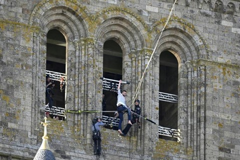 Le funambule a prévu de rééditer sa traversée mercredi après-midi 25 mai, cette fois dans l'autre sens en partant de l'abbaye, pour "faire des images", selon son équipe.
