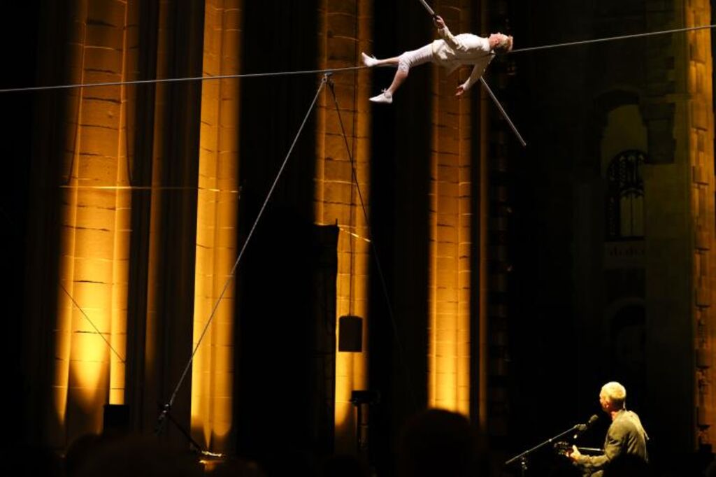Dans la cathédrale Saint-Jean-le-Théologien (Saint John the Divine), l'une des plus grandes églises du monde, qui accueille nombre d'évènements et de festivals insolites, Philippe Petit a célébré son exploit jeudi 8 août en marchant sur un fil tendu dans la nef.
