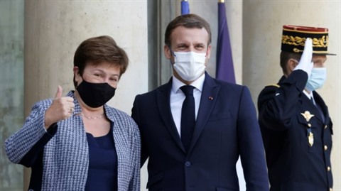 | La directrice générale du FMI, Kristalina Georgieva, et le président français Emmanuel Macron, à l'Élysée le 12 novembre 2020. |