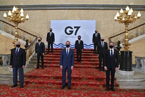 | Photo de famille des ministres des Affaires étrangères du G7, le 4 mai à Londres. |
