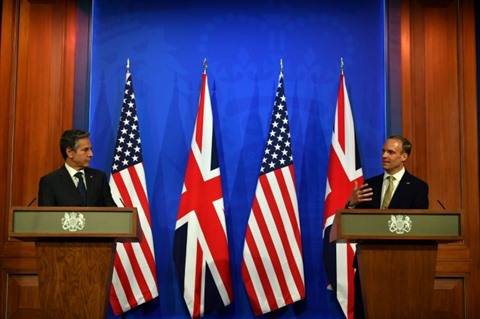 | Le secrétaire d'État américain Antony Blinken (gauche) et son homologue britannique Dominic Raab lors d'une conférence de presse, le 3 mai à Londres. |