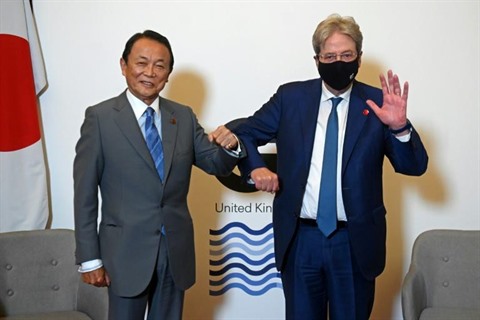 | Le ministre japonais des Finances, Taro Aso (gauche), et le commissaire européen aux Affaires économiques, Paolo Gentiloni, lors du premier jour du G7 Finance à Londres, le 4 juin. |