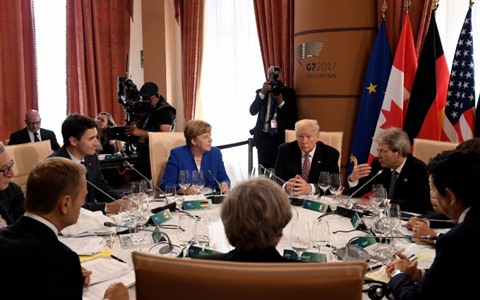 | Des dirigeants du G7, dont la chancelière allemande Angela Merkel, le président américain Donald Trump et le Premier ministre italien Paolo Gentiloni, lors d'un déjeuner de travail, le 27 mai à Taormina, en Sicile. |