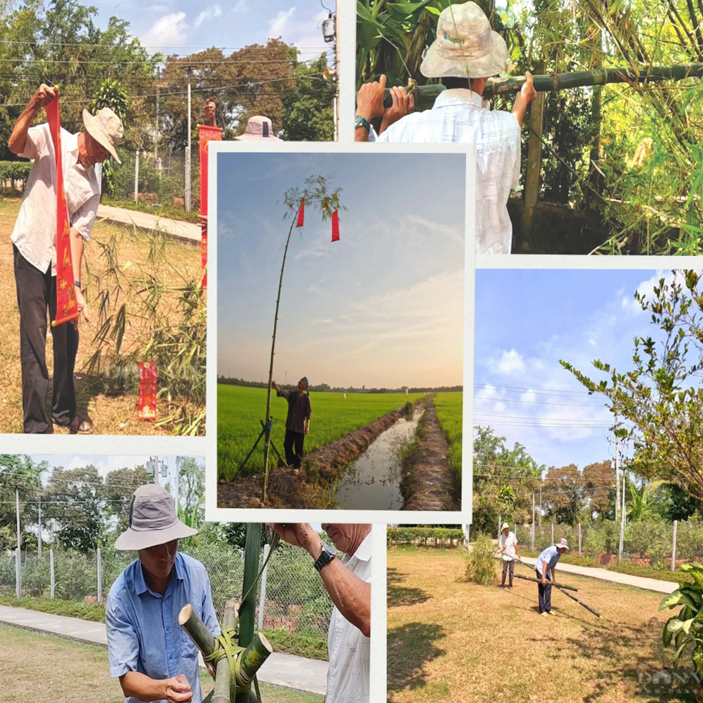 Selon M. Ly, cette tradition lui a été transmise par ses aïeux : ériger le cây nêu permettrait de chasser les esprits malins et d’invoquer la prospérité pour l’année à venir. Il choisit toujours un bambou âgé, droit et élancé - au moins dix mètres de haut - dont il soigne particulièrement le sommet, garni de feuilles et de branchages. Pour stabiliser ce géant végétal, il creuse un trou profond devant sa maison et fixe la base à l’aide de trois piquets en bambou.