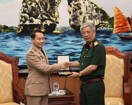 | Le général Nguyên Chi Vinh (droite), vice-ministre vietnamien de la Défense, et le colonel Krieng Anantasa, attaché militaire thaïlandais, le 3 octobre à Hanoi. |