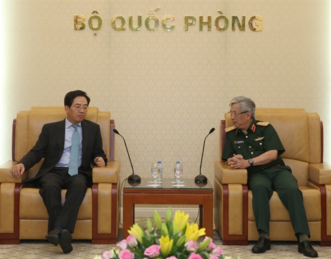 | Le vice-ministre de la Défense, le général Nguyên Chi Vinh (droite), et l'ambassadeur de Chine au Vietnam, Hong Xiaoyong. |