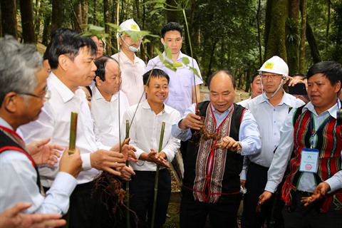 | Le président de la République, Nguyên Xuân Phuc (3e à droite, en tenue traditionnelle des hauts plateaux du Centre), visite la zone de culture de ginseng de Ngoc Linh à Kon Tum. |
