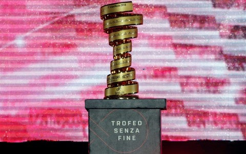 | Le trophée du Giro d'Italie exposé à Jérusalem le 9 mai, avant le départ de l'édition 2018. |