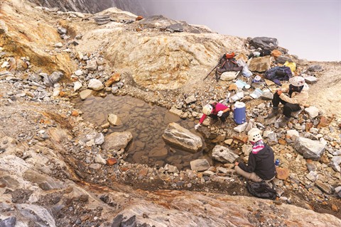| Des scientifiques font des relevés dans un petit lac formé par la fonte des neiges du glacier Humboldt dans le Parc national de la Sierra Nevada de Mérida, au Venezuela. |