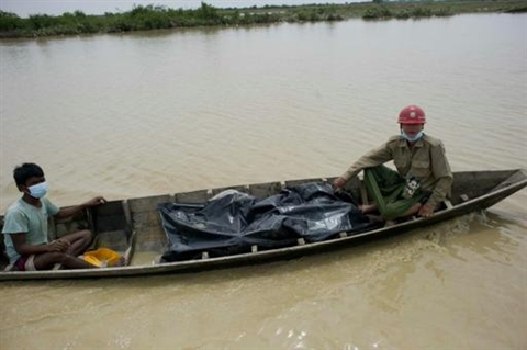 | Des sauveteurs locaux transportent un corps dans un bateau près de Mrauk dans l'État de Rakhine au Myanmar, le 4 août. |