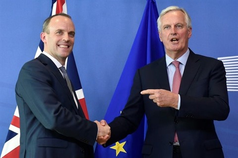 | Le ministre britannique du Brexit, Dominic Raab (gauche), rencontre Michel Barnier, chef de la négociation sur le Brexit pour l'UE, à Bruxelles, le 19 juillet. |