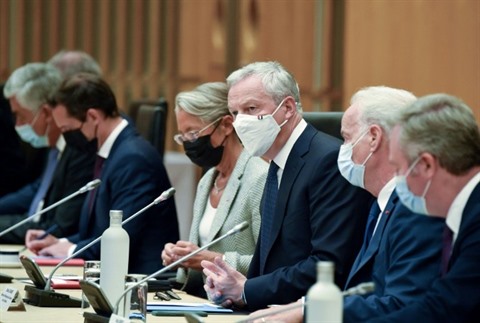 | Le ministre français de l'Économie, Bruno Le Maire (centre), lors d'une réunion avec des représentants du commerce, du tourisme et de l'évènementiel affectés par la crise sanitaire, au ministère à Paris, le 30 août. |