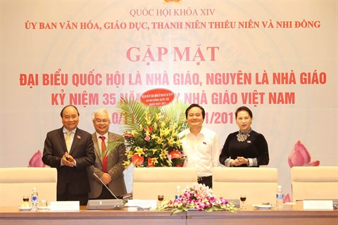 | Le PM Nguyên Xuân Phuc (1er, à gauche) et la présidente de l’AN Nguyên Thi Kim Ngân (1ère, à droite) à la rencontre des députés de l'AN vietnamienne qui sont enseignants et anciens enseignants, le 17 novembre, à Hanoï. |