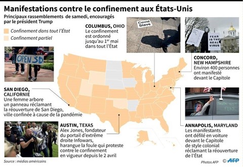 Donald Trump avait appelé vendredi 17 avril à "libérer" du confinement trois États gérés par des gouverneurs démocrates, Michigan, Minnesota et Virginie. Samedi 18 avril, de nouvelles manifestations réclamant la fin du confinement ont eu lieu du New Hampshire à la Californie, en passant par le Texas, le Maryland ou l'Ohio.