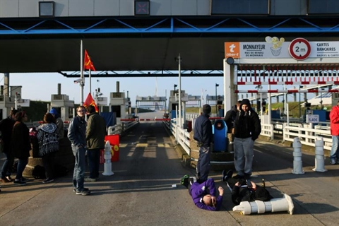| Des syndicalistes bloquent le péage du pont de Normandie au Havre, le 26 mai. |