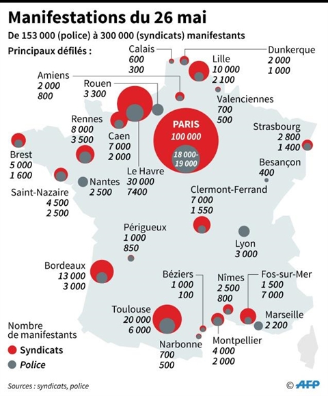 Chiffres nationaux et principaux défilés contre la loi travail, le 26 mai. Photo : AFP/VNA/CVN |
