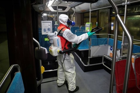 | Un salarié d'une entreprise de nettoyage désinfecte un bus de la RATP, à Paris le 5 mai. |