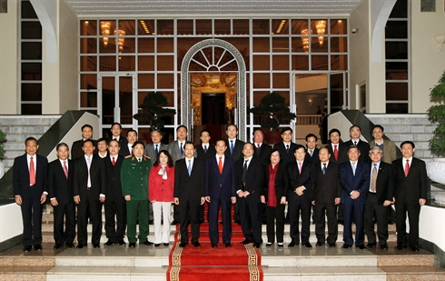 | Le Premier ministre Nguyên Tân Dung (premier plan, au centre) entouré des membres du gouvernement, le 26 décembre à Hanoi. |