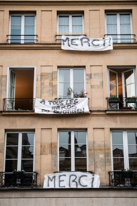 | Des bannières en soutien aux soigants sur des balcons parisiens, le 22 avril. |