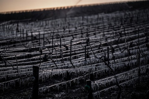 | Dans le vignoble de Chablis, en Bourgogne, le 7 avril après un épisode de gel. |