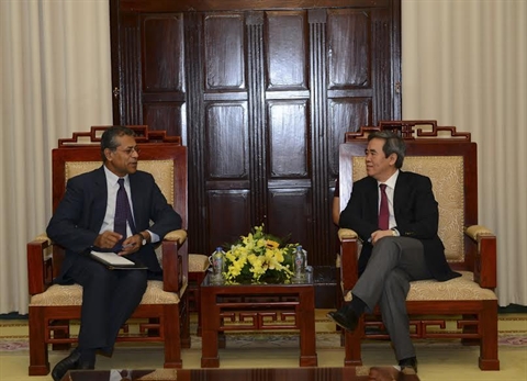 | Le gouverneur de la Banque d'État du Vietnam, Nguyên Van Binh (droite), et le représentant en chef du FMI, Sanjay Kalra, le 29 juillet à Hanoi. |