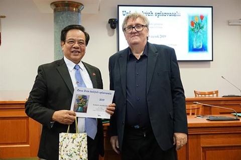| L’ingénieur vietnamien Nguyên Quyêt Tiên (gauche) avec le prix littéraire tchèque 2019. |
