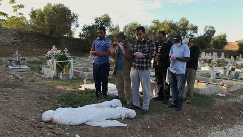 | Capture d'écran d'une vidéo réalisée par le JRI grec Will Vassilopoulos montrant des migrants priant devant la dépouille d'une jeune migrante, lors d'une cérémonie à Lesbos, le 30 septembre 2015. |